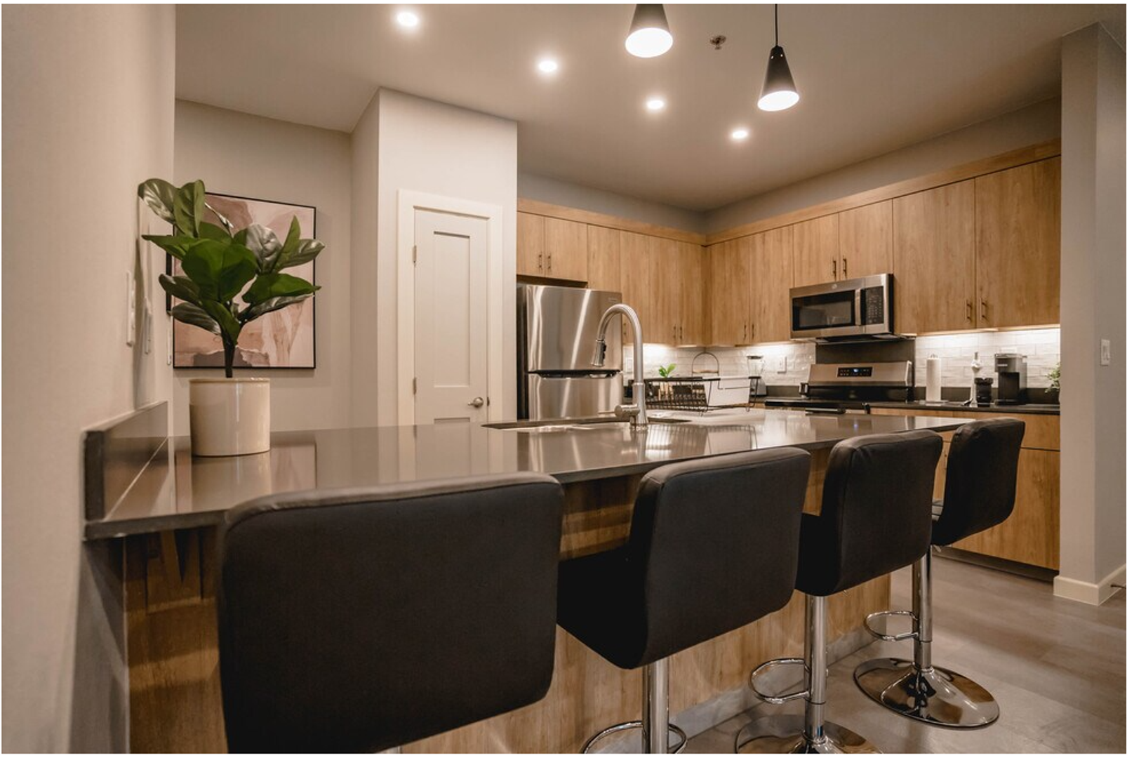 Featuring modern appliances, including a stove, fridge, microwave, and dishwasher, this apartment is designed for comfort and convenience.